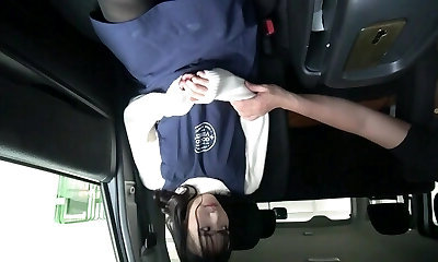 Japanese brunette moans while being pleasured in the van